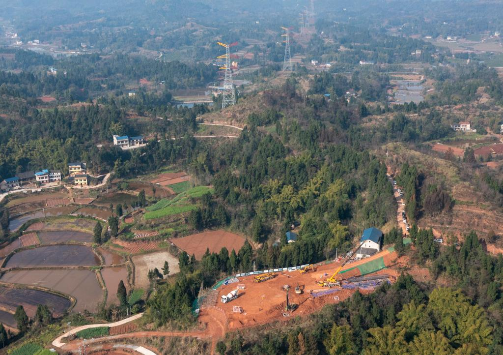 川渝1000千伏特高压交流工程施工现场 ,一片忙碌情形(无人机照片)。新华社记者刘潺 摄