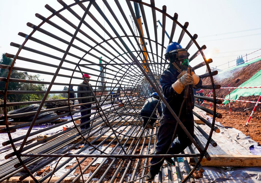 在重庆市潼南区小渡镇川渝1000千伏特高压交流工程施工现场 ,工人举行焊接作业。新华社记者刘潺 摄