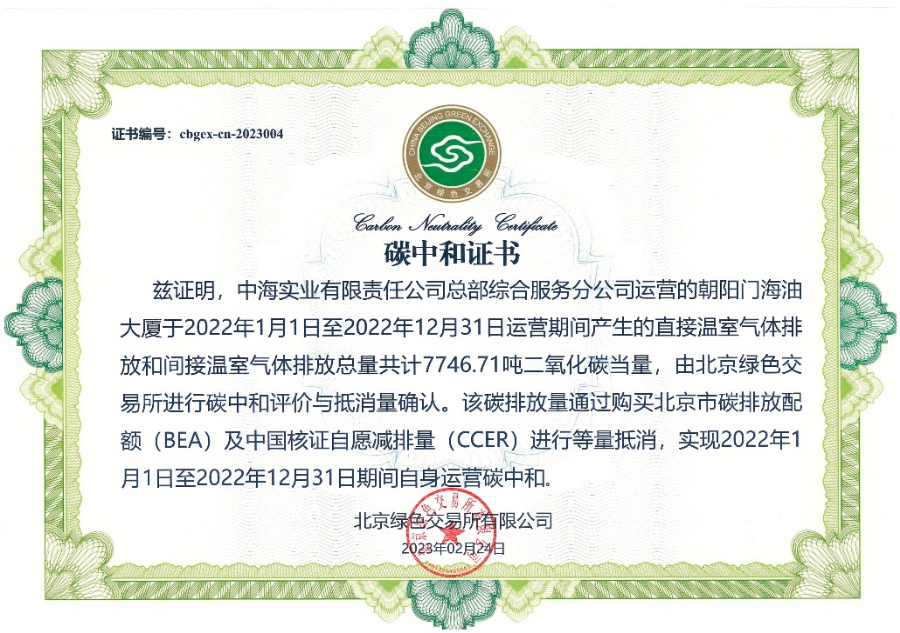 北京绿色生意所凭证制订碳中和妄想、实验减排行动、碳排放核算、北京碳配额及CCER等量抵消,“碳中和”评价和声明等全流程要求,支持中国海油总部大楼实现年度自身运营“碳中和”目的,并揭晓“碳中和”证书。