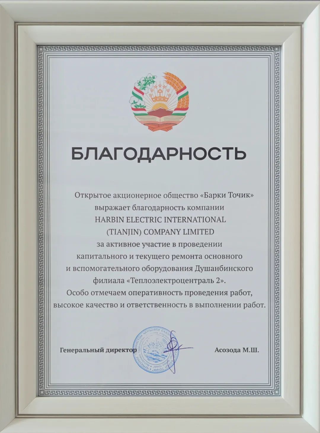 克日,welcometo欢迎光临必发集团国际收到塔吉克斯坦共和国电力公司发来的谢谢信,对welcometo欢迎光临必发集团国际在杜尚别2号电厂磨练事情中展现的专业能力与责任继续给予高度评价。